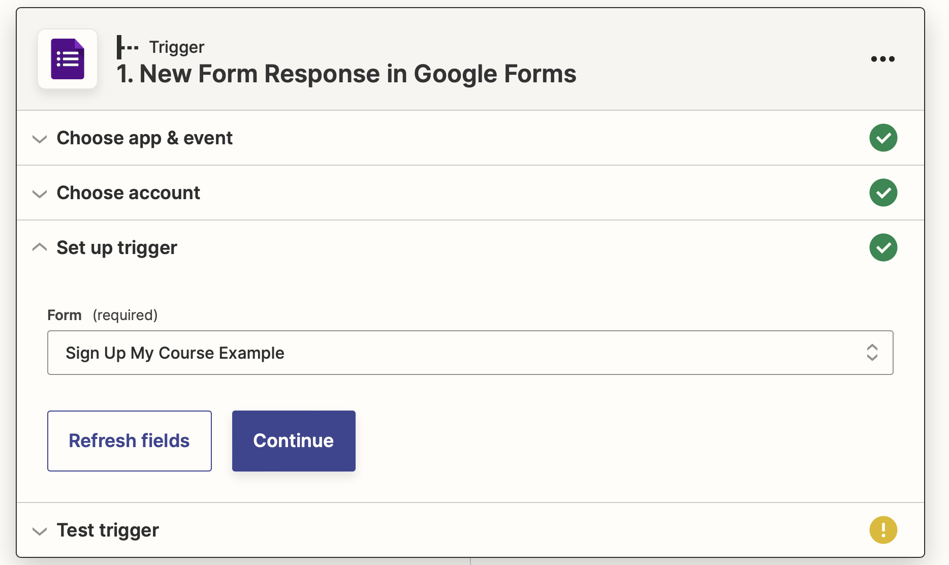 Then you need connect with your google form account. Once it is done, you can choose which form, which in my case, it is "Sign Up My Course Example" form.