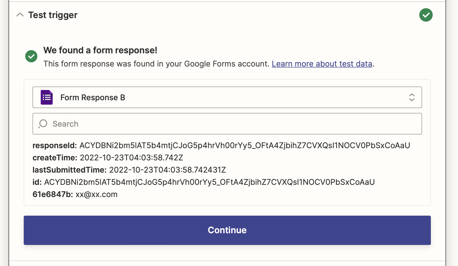 Once continue, you will asked to test the trigger. If you go to the form and submit a sample response, then you will see the test is triggered. Now you are done with the trigger part!