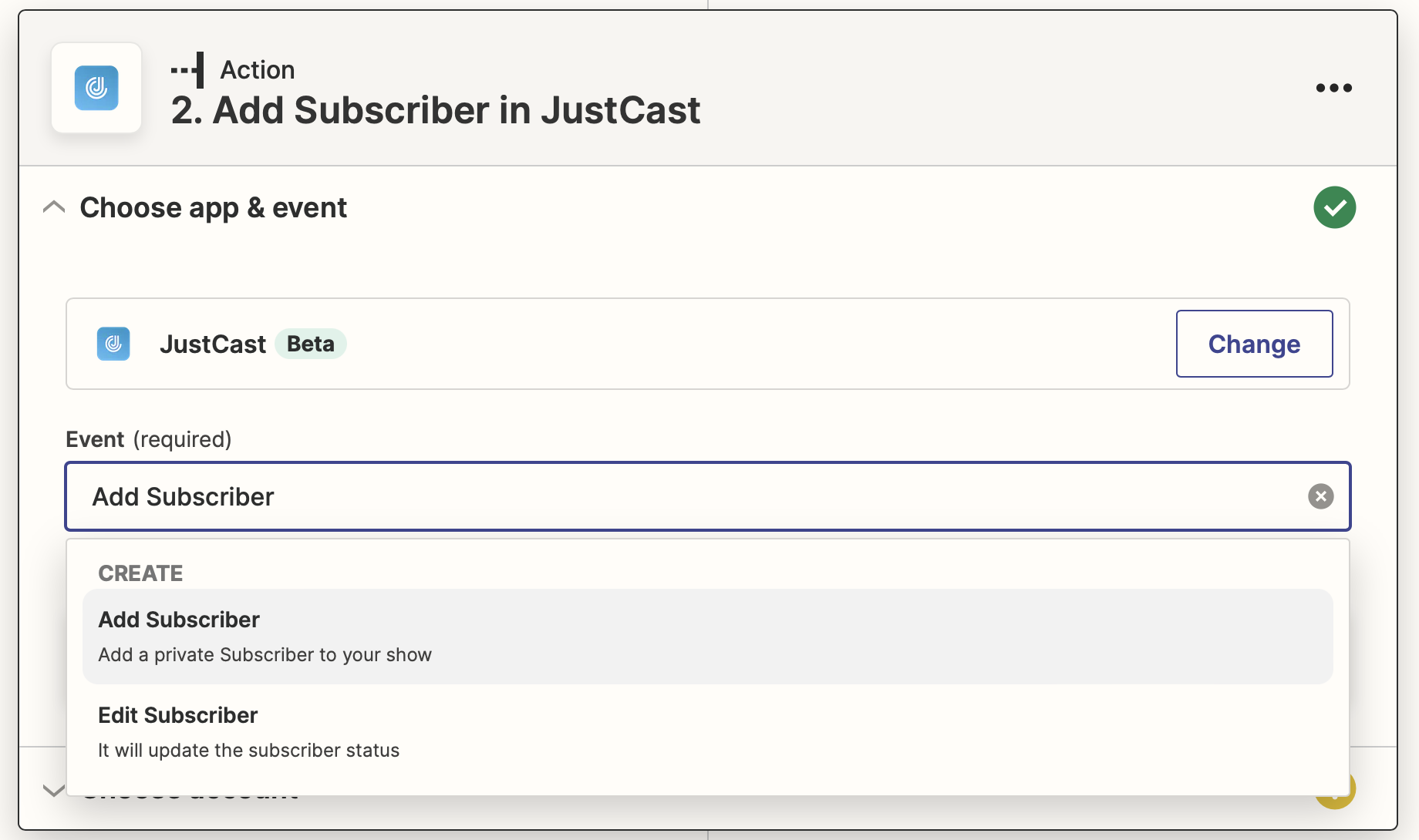 Next, we will start the action part. Search JustCast in the action and then select it. Then in the event, you can choose "Add Subscriber" or "Edit Subscriber", in this case, we would like to choose "Add Subscriber" as we want to add a subscriber when the google form is submitted.