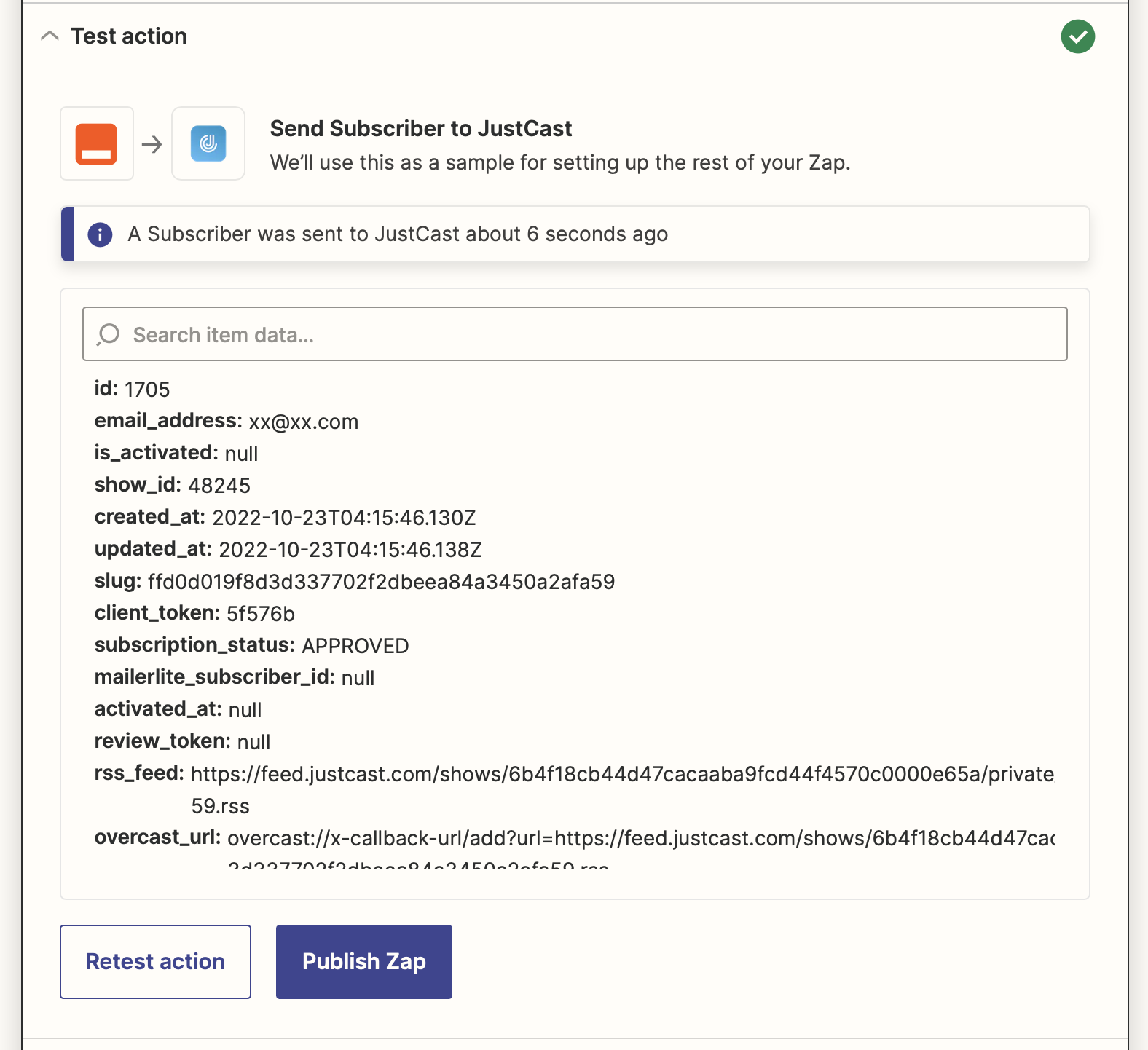 In summary, a google form submit will trigger the Zap and then use the google form submit data, email address in this case, to add a listener to the feed inside JustCast. This is just an example and in your case, you probably want to connect to some payment page like stripe or others. We will provide more examples later.